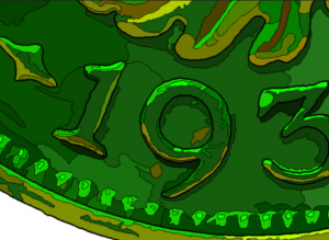 The method used to produce these pieces relies on a complete re-drawing of the coin surface, including all identifiable blemishes, and recolouring of each identified region using a suitable colour from a range which may be decided on the basis of the original coin material, the motif used in the decoration, or the general history of the coin. None of these pieces are processed photographs, they are all original works.