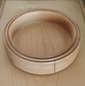 The bowl is in beech and is shown on a sycamore table. The line on the bowl wall is entirely natural and just happens to correspond with the table stringing.