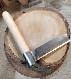 The final picture below shows a specialist’s version – this is the chairmaker’s froe, designed for hand splitting of small spars for use in furniture. The blade, which is made from polished and ground tool steel, is about 15 cm / 6″ and the tool is supplied with a fitted beech handle.