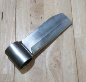 A froe is an ancient tool, in common use for splitting wood accurately, for many hundreds of years. Before the invention of modern welding techniques, the eye would be formed by the local blacksmith bending part of the billet round in a circle. With reliable welding techniques available, good quality froes may be made more simply and accurately by welding a shaped blade to a pipe section, as shown in the pictures below.