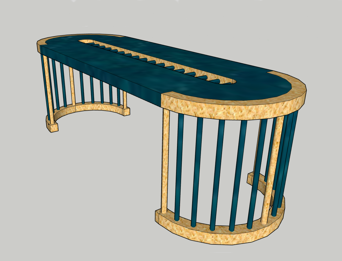 The Rain table shown here uses a contrasting deep blue and natural wood colour scheme although other schemes are available. The ends are supported by semicircular column arrangements and the centre of the table provides a gap for routing of cables etc.